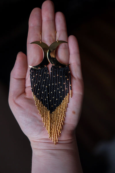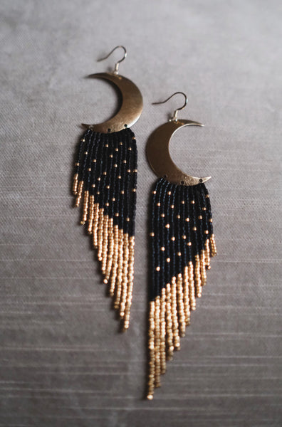 These fringe earrings are made with raw brass crescent moon pendants. They are made with matte black and gold delica seed beads and strung with nylon thread. These earrings are 5.3" long and 1.5" wide.
