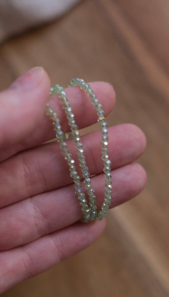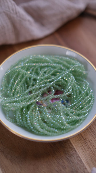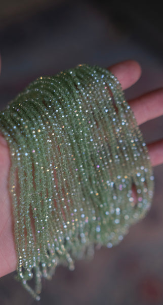 These faceted glass beads feature a stunning AB color plating—one side featuring a shimmering, iridescent glow over a sweet pale green base. They catch the light beautifully and change colors with every movement. Sold by individual strand.