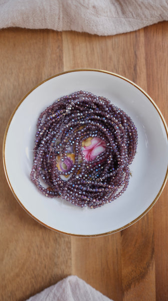 These faceted glass beads feature a stunning AB color plating—one side featuring a shimmering, iridescent finish over a dusty, "Old Rose" purple base. They catch the light beautifully and change colors with every movement. Sold by individual strand.