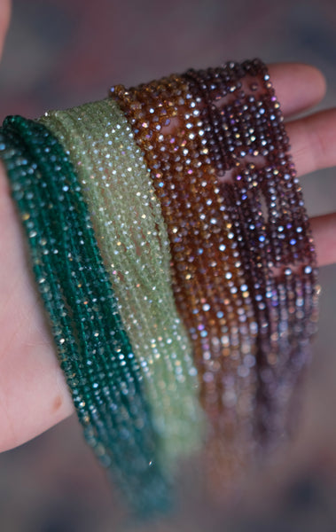 This curated set features four distinct glass strands in earthy, botanical tones. From high-clarity Emerald to multi-chrome Solar Flare, these faceted rondelles are perfectly coordinated for jewelry sets that require a mix of iridescence and depth.