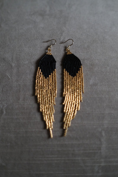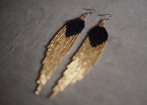 These fringe earrings are made with matte black and gold delica beads and nylon thread. They are 5" long, and about 1" wide and they are very lightweight.