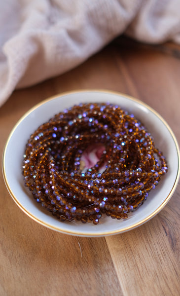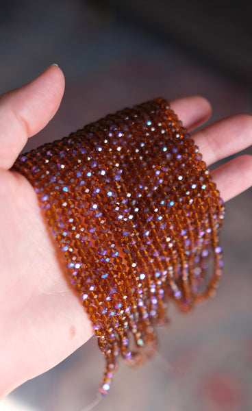 These faceted glass beads feature a half-rainbow electroplate finish—one side featuring a shimmering multi-color oil slick over a rich, volcanic Dark Goldenrod base. They catch the light and change colors with every movement. Sold by individual strand.
