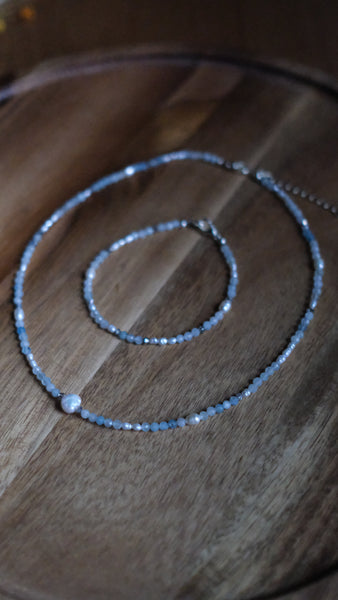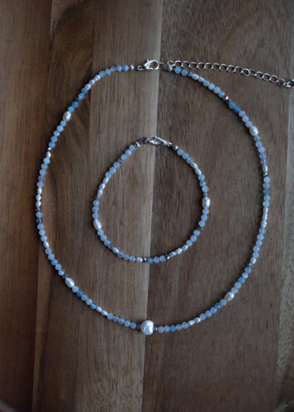 This necklace and bracelet set is made with natural aquamarine beads, freshwater pearls, and crystal bicones. The necklace is 15.5” long with a 3” extender chain. The bracelet is 7.5” long.