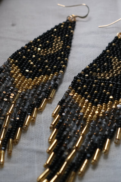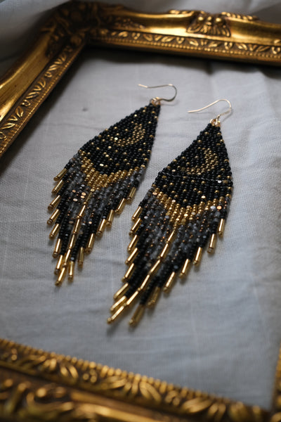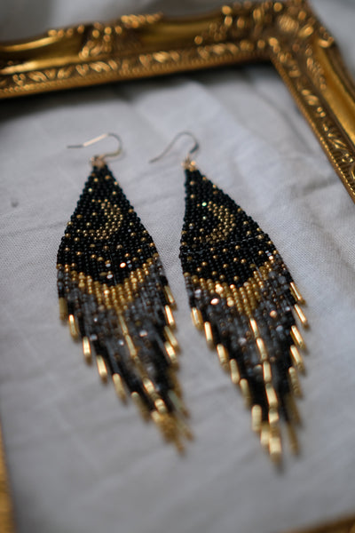 These starry night statement earrings are made with size 11/0 black, gold and opal aurum charlotte beads along with gold bugle beads. These earrings have 15 rows of fringe across each earring, they are 4.8" long, 1.3" wide and are fitted with sterling silver ear wires. These earrings are lightweight and weigh exactly 0.20oz each.