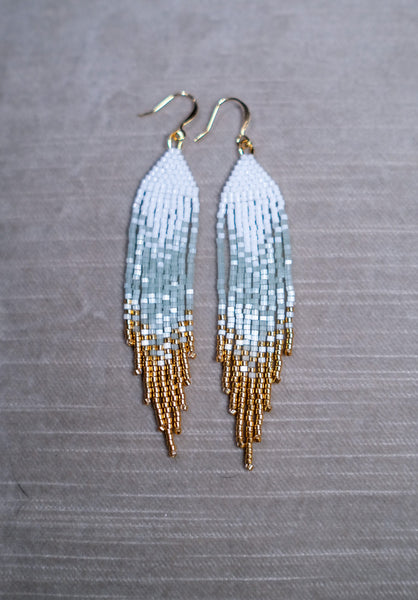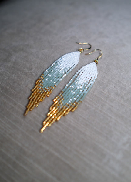 These fringe earrings are made with white, gold, and satin green size 11 delica beads. They are about 4" long, 0.7" wide. They are fitted with 14k gold wire guards and 14k gold ear wires.