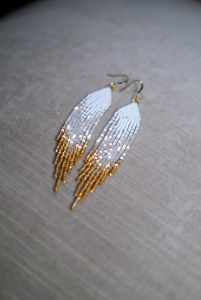 These fringe earrings are made with white, gold, and satin linen size 11 delica beads. They are about 4" long, 0.7" wide, and are made with gold plated brass ear wires.