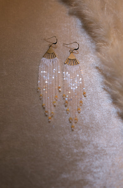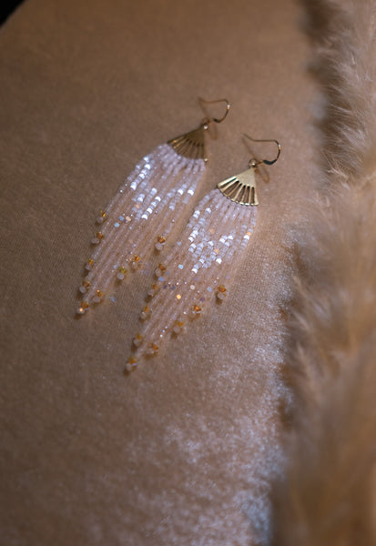 These sparkle fringe earrings hang 3.8" long from the gold filled hook to the bottom bead. They are 0.7" wide. They weigh exactly 0.10oz per earring. They are lightweight and are fitted with 14k gold ear wires.