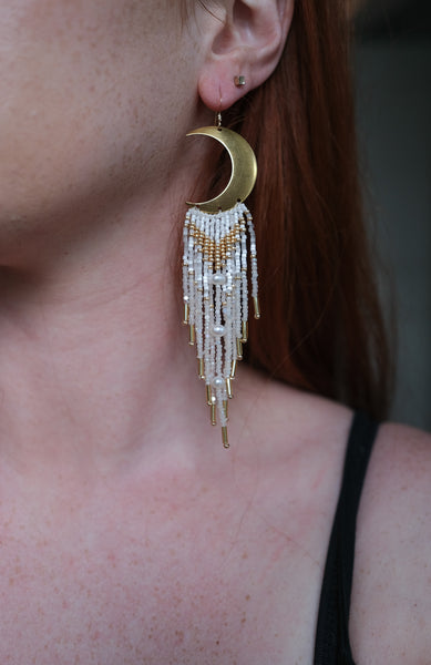 These fringe earrings are made with white and satin delica beads, gold seed beads, opal charlotte beads and gold filled bugle beads. They are fitted with crescent moon pendants and hang 5.1" long. Each earring is strung with three individual fresh water pearls. They are fitted with 14k gold filled ear wires and they are very lightweight.