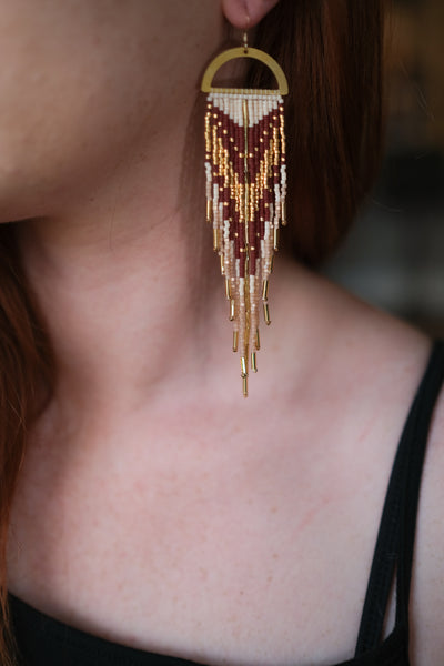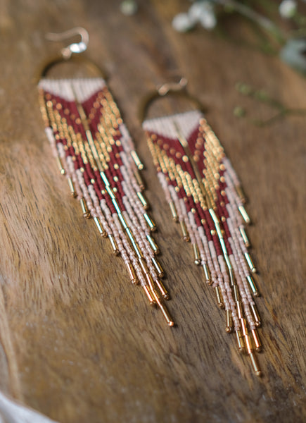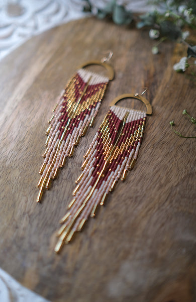 These statement fringe earrings are made with matte sand, gold, espresso and satin pink delica beads. They are also accented with 24k gold plated bugle beads. They are about 5.6" long, 1.1" wide. They weigh 0.19oz each and are made 14k gold filled ear wires.